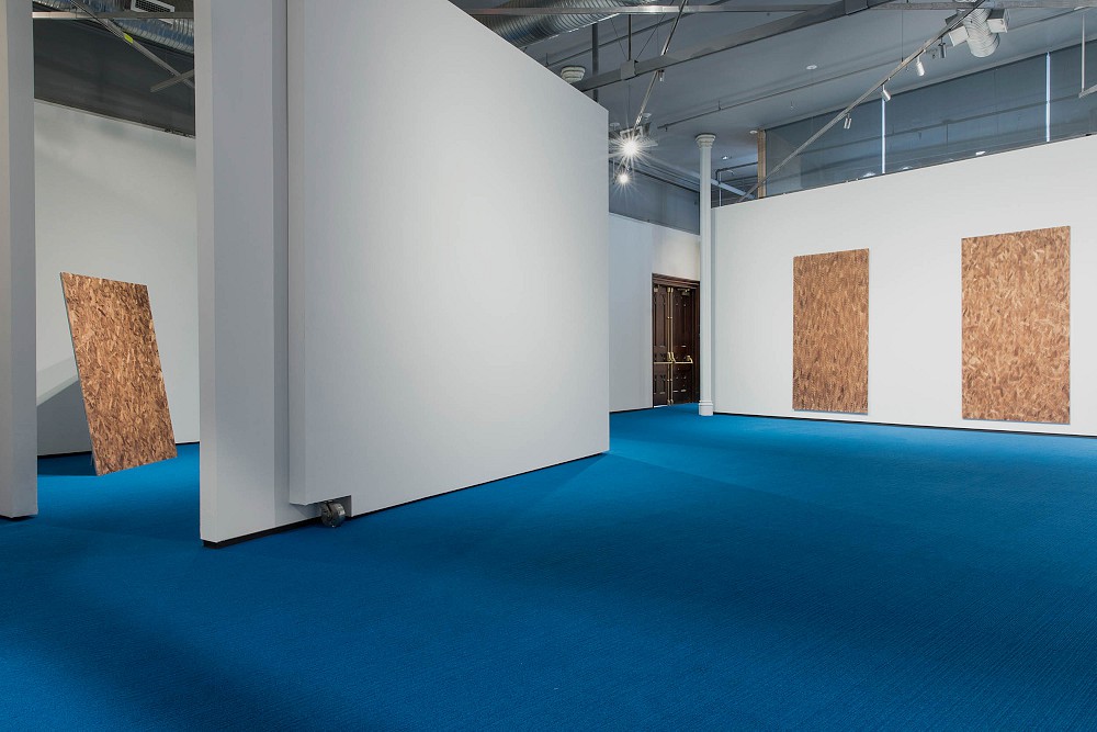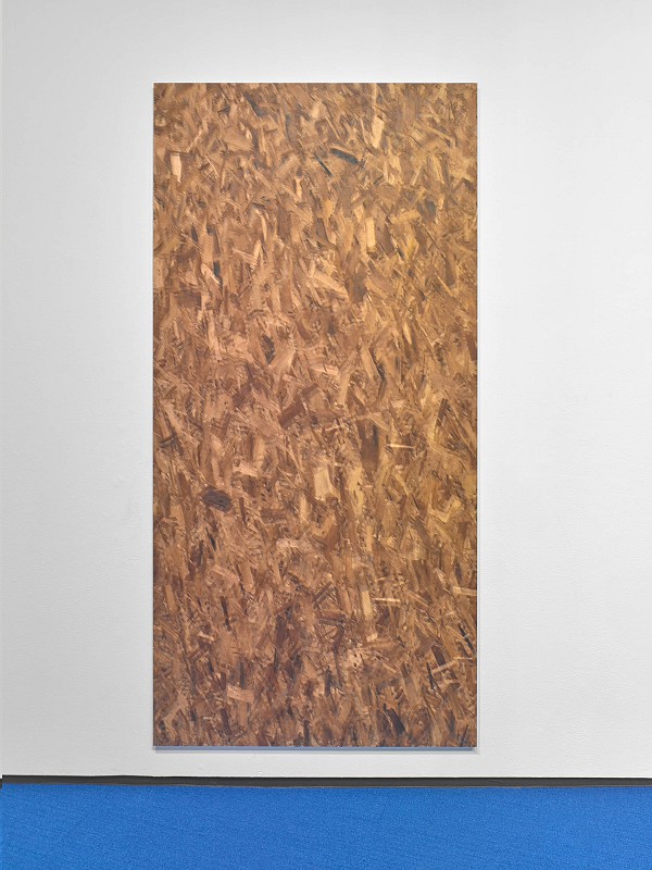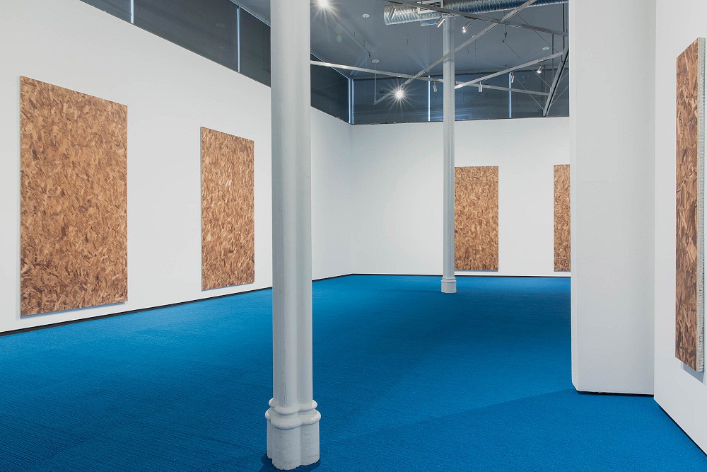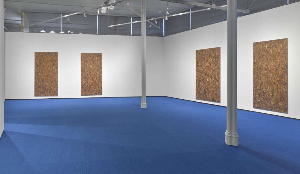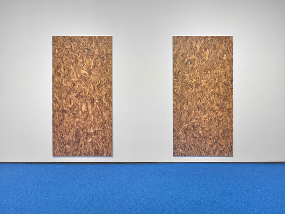 Jacob Kassay's new works are made up of oriented strand board (OSB), an engineered wood similar to particle board. Here, flakes closest to the surface are photographed and reprinted atop the subject/substrate, and stand in for pixelated image data; the actual and the depicted are collapsed onto a single stratum that compresses source and secondary information into a kind of schism. The effect of this attenuated rendering mimics the way we process virtual spaces where frames per second and point of view are simultaneously explored by both gamers and characters in the game itself.