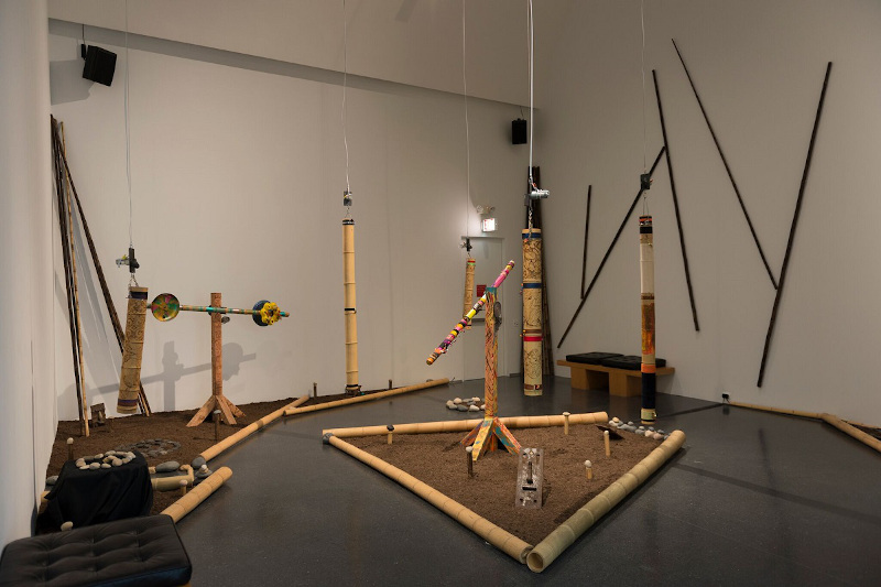The Rio Negro project dates from 1992, when Douglas R. Ewart and George Lewis, with the help of technological artist Christopher Furman, created the work for a show at Chicago’s now-defunct Randolph Street Gallery. Rio Negro is centered on the sound of rainsticks. As Ewart has remarked, “The reason that I use rainsticks is because I like the idea of something that can be functional and at the same time be esoteric. There is something life-like about a rainstick.” Ewart’s rainsticks range between four and six feet in length. With their complex blend of sonic and visual aesthetics, which reference the African-descended Jonkonnu performance traditions of his native Jamaica, Ewart’s rainsticks may be considered more as totemic sound sculptures. In the original Rio Negro, these sculptures were performed by computerized motors selected and mounted by Furman, controlled by software written by Lewis that also composed and performed electronic music in real time. In Rio Negro II, first shown at the Contemporary Arts Museum Houston in 2007, Douglas Repetto designed individualized robotics and micro-controllers for each of the rainsticks, while Ewart crafted giant bamboo chimes that are also mechanically activated and controlled through Repetto’s robotics.