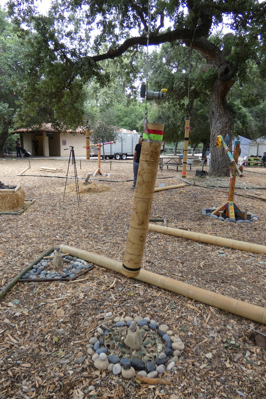 The title of the work references the Rio Negro in Brazil, a major tributary of the Amazon river, and the largest black-water river in the world. Lewis’ sister visited the river basin in the early 1990s, and her piquant description of the environment inspired Ewart and Lewis to settle on the name “Rio Negro” as a way of referencing both indigenous people and notions of blackness. The name also suggests the sounds of rain-forests, and the work’s strategically conceived silences enhance the nature of the work as a space for contemplation. The assemblage-like layout of the work, designed in site-specific fashion by Ewart and Repetto, includes stones, soil, bamboo, and leaves, all of which evoke aromas along with the visual and sonic aspects. Electronic sounds appear along with the physically generated sounds. The works provenance as an evocation of the forest proves highly compatible with the raw, post-industrial aesthetic grandeur and other-worldly acoustics of Silo City’s Marine A Grain Elevator.