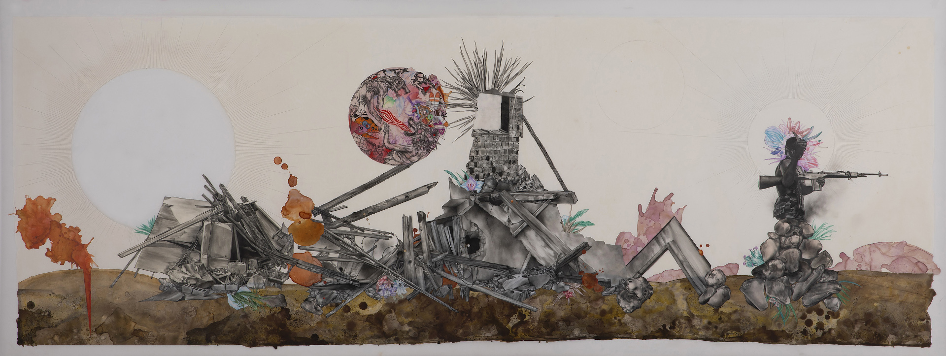 Drawn with great delicacy and a rich, almost romantic palette, Castillo's drawings do not hesitate to collide abrupt and startling images into new hybrids—at once disruptive and disturbing while simultaneously evoking a lush eloquence. Concocted as narratives, his drawings are non-linear in aspect and intuitively construct memory as a mechanism of personal myth-making within which politics and modes of resistance can speak to a process of reconciliation, repair and healing.