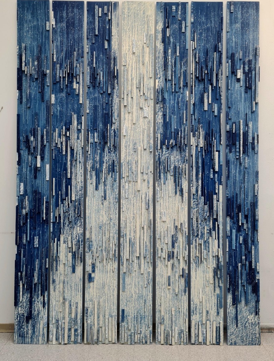 The series presents various states of water, ranging from stillness to turbulent waves, through two large-scale installations, a drawing, and a stop-motion video. In one of the large-scale installations, I used the cyanotype technique on paper and collaged the prints onto more than one thousand pieces of wood, forming a symbolic reference to Niagara Falls. In the cyanotype process to produce this artwork, glass played a crucial role in transforming the drawing on paper, and because the process itself unfolds in liquid, this work led me to develop a new approach using glass in a subsequent large-scale installation.