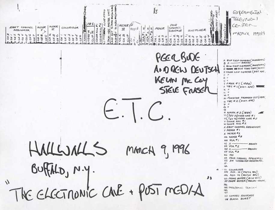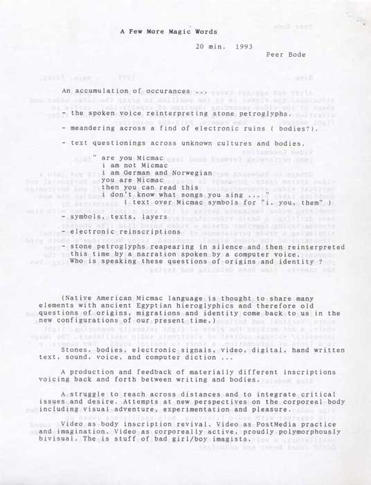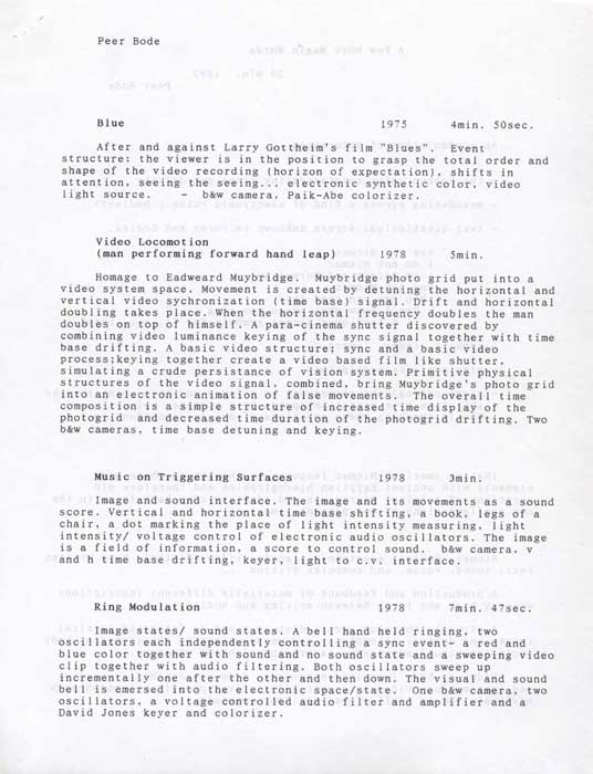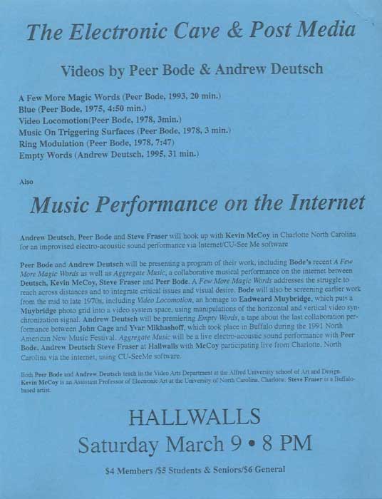 Recent work by Peer Bode and Andrew Deutsch featuring: A FEW MORE MAGIC WORDS (Peer Bode, 1993, 20 min); BLUE (Peer Bode, 1975, 4:50 min); VIDEO LOCOMOTION (Peer Bode, 1978, 3 min); MUSIC ON TRIGGERING SURFACES (Peer Bode, 1978, 3 min); RING MODULATION (Peer Bode, 1978, 7:47 min); EMPTY WORDS (Andrew Deutsch, 1995, 31 min); AGGREGATE MUSIC (Andrew Deutsch; Kevin McCoy; Steve Fraser; Peer Bode; improvised electro-acoustic sound performance via internet/CU-See Me software)