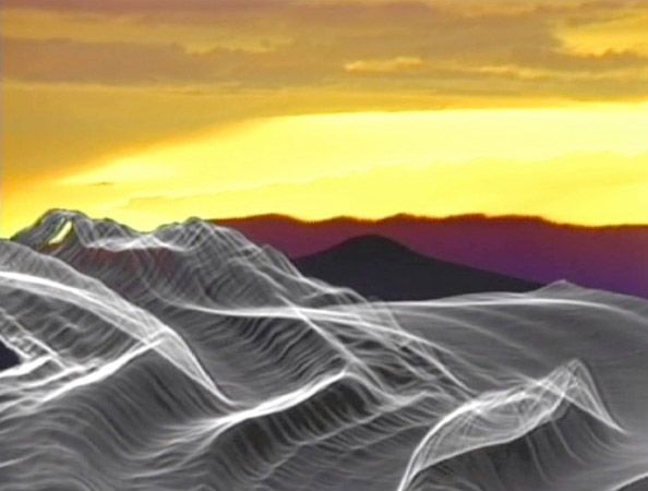 ART OF MEMORY is Woody’s midlife articulation of memory and personal history where film clips from 20th century conflicts are “projected” onto the mesas of a Southwestern landscape (their home from 1980 onward). The mesas are created both through camera documentation and Woody's use of a Rutt/Etra, a critical instrument for him, enabling a restructuring of the conventional rectilinear video frame.