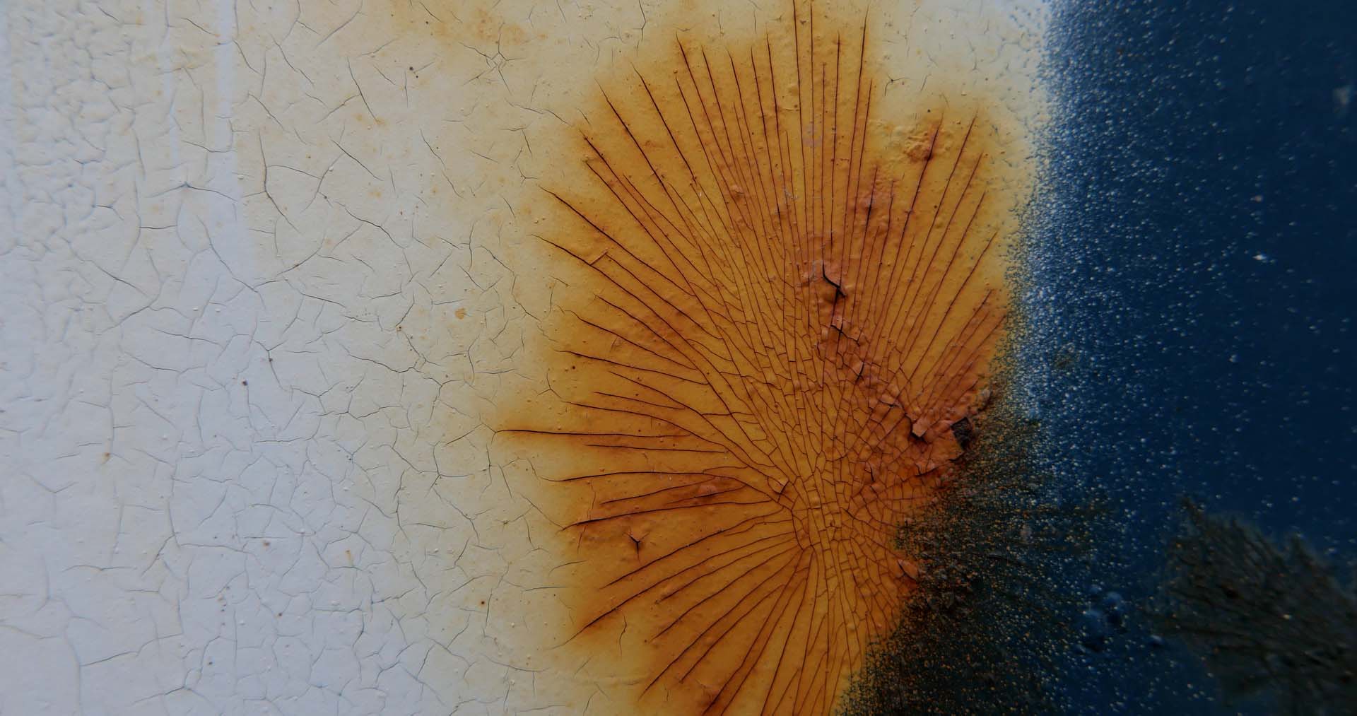 de-composition I Laura Kraning A textural macro collage of a rust belt landscape-scratched, splattered, dripping, cracking, and bursting to the surface. Photographed and meticulously edited over one year in Buffalo, NY, the reverberant tones of the New York Central rail line provide the rhythmic pulse to a rapid cascade of multihued material decay and metallic de-composition.