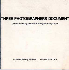 THREE PHOTOGRAPHERS DOCUMENT: Ginafranco Gorgoni/Babette Mangolte/Harry Shunk (October 6-29, 1978), Hallwalls Inc, Buffalo NY, 1978. [These photographs document many temporary environmental works such as Spiral Jetty by RobertSmithson in 1970. The catalogue was designed by guest curator Debbie DeStaffan. 8 pages in black in white, photographs, some text. ]