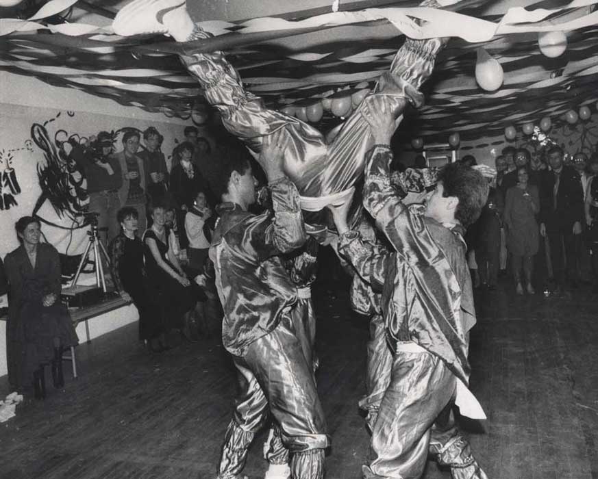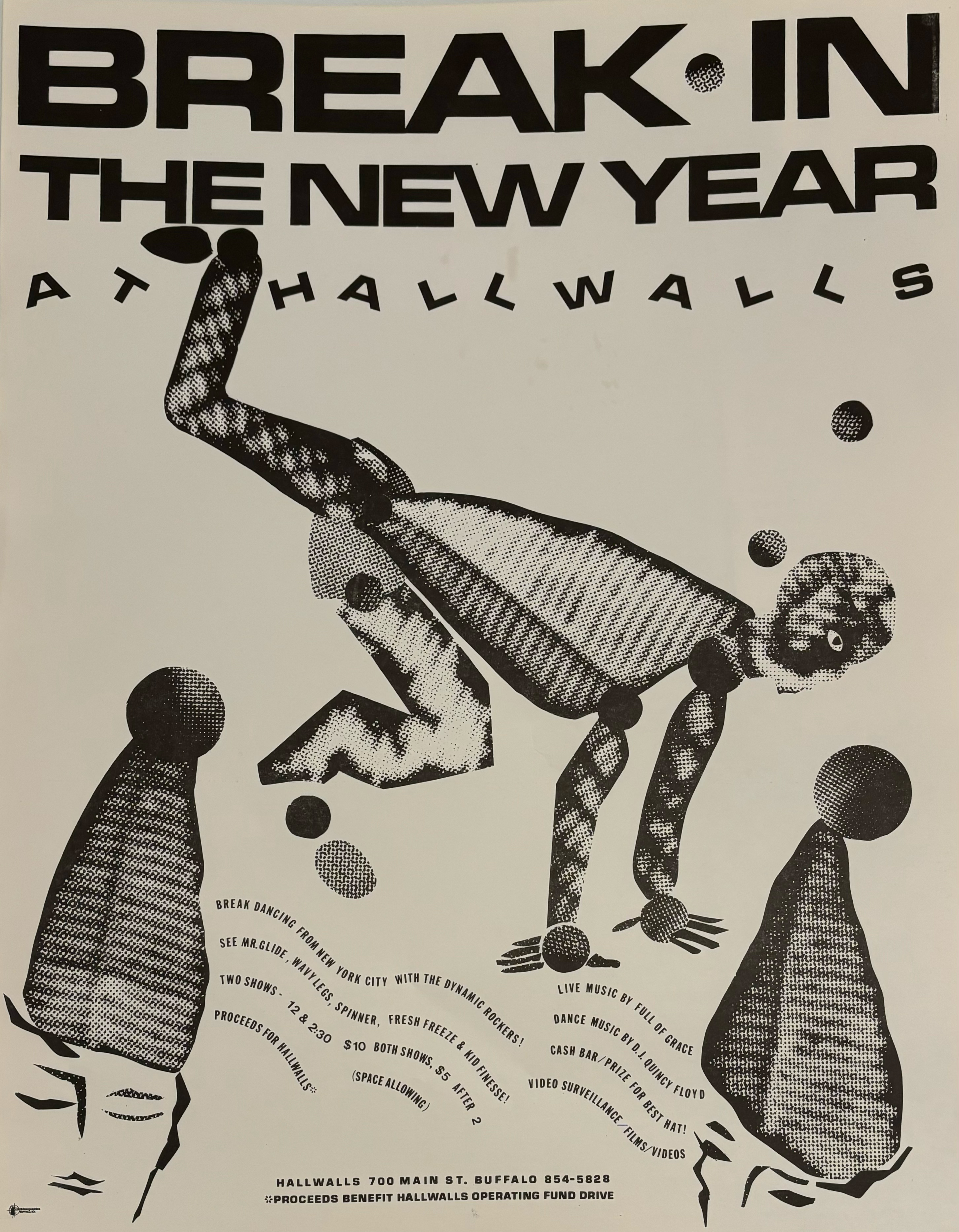 New Year's Eve party and Hallwalls fundraiser with the Dynamic Rockers (featuring Wavy Legs, Mr. Glide, Fresh Freeze, Kid Finesse, Spinner); live music by Full of Grace; Dance music by DJs Quincy Floyd and Allen Williams; and continuous film screenings and Big Brother Video. Two bottles of champagne awarded for the Best Party Hat! [Note, December 1983 calendar indicates a performance by Rockwell, Inc (New York City's best Break Teams) not Dynamic Rockers, but January 1984 calendar indicates Dynamic Rockers and does not mention Rockwell, Inc.]