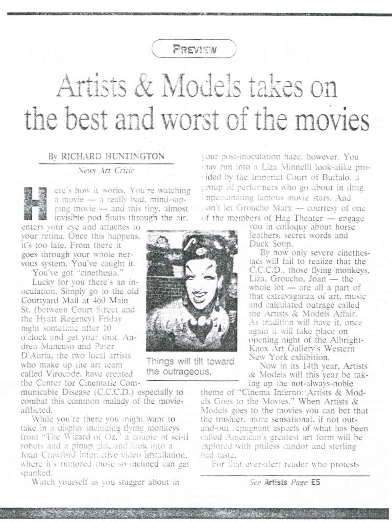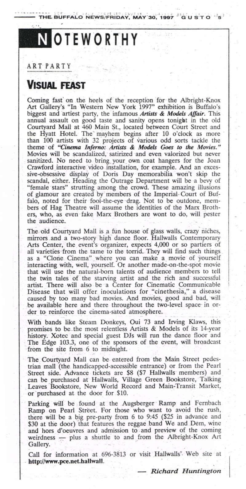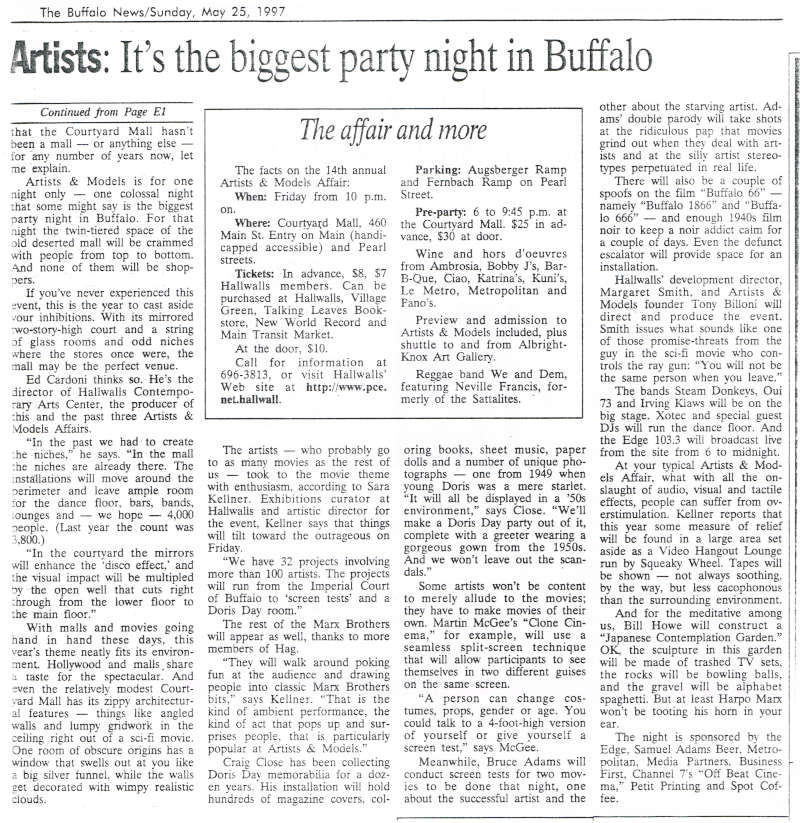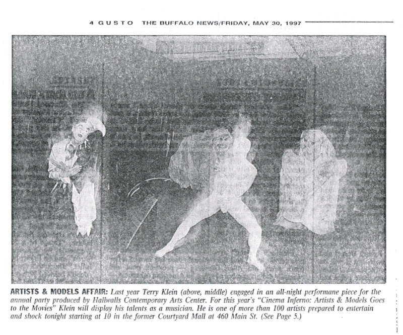 Artist and Models Goes to the Movies. Hallwalls' semi-annual fundraiser featuring site-specific works and performances by local artists and performers. Musical Performances by Irving Klaws; OUI 73; Yolk; Steam Donkeys; X-O-Tec; members of the Imperial Court of Buffalo; the University at Buffalo's Hiller Ensemble; Aggregate Music (Peer Bode and Andrew Deutsch); Composers Alliance of Buffalo; and Jazz Works