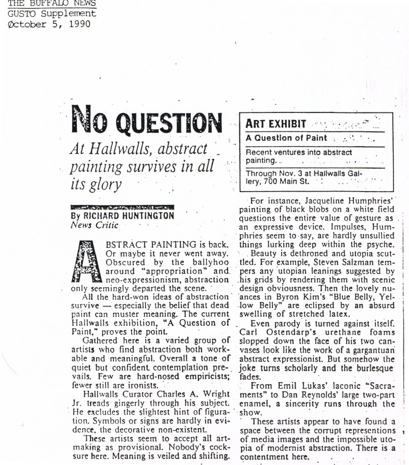 Exhibition curated by Charles A. Wright Jr., including: Tom Brazelton; Richmond Burton; Gail Fitzgerald; Jonathan Genkin; Nancy Haynes; James Hyde; Jacqueline Humphries; Bill Komoski; Daniel Levine; Emil Lukas; Gregory Montreuil; Carl Ostendarp; Byron Kim; Dan Reynolds; Leslie Roberts; Steven Salzman; James Siena; John Zinsser.