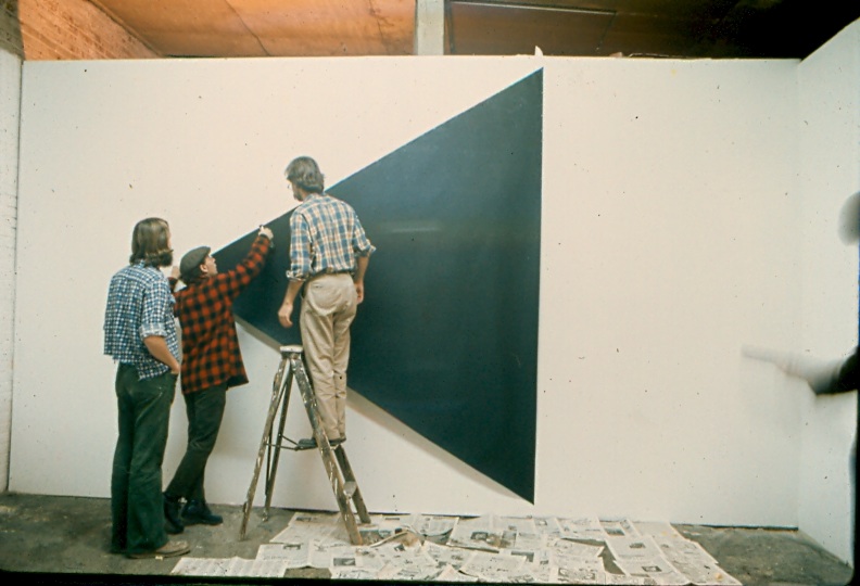 Exhibition of 2-dimensional works by Joel Fisher; Marcia Hafif; Frank Owen; Robert Petersen; Robert Ryman; Richard Serra; Michelle Stuart; and Kes Zapkus. Coordinated [curated] by Hallwalls Co-Director Charles Clough. Due to size limitations, Richard Serra's "Willis Avenue" is on view at 30 Essex St. [Photos of its installation at 30 Essex St. are shown on this page. Charlie Clough is on the ladder.]