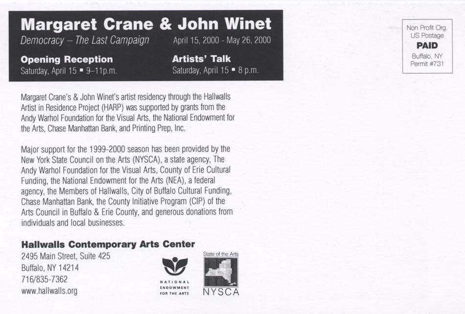 Democracy: The Last Campaign (D–TLC) is a national yearlong multi-media project focusing on the 2000 elections. It is produced by the collaborative team Margaret Crane/Jon Winet. The project includes the D–TLC web site and an interconnected series of public forums, publications and exhibitions. Crane and Winet were the first virtual residents sponsored by the Hallwalls Artists-in-Residence Project (HARP), funded with grants from both the NEA and The Andy Warhol Foundation for the Visual Arts. As part of their residency, the artists shot a series of 45 short videos at locations around the country during presidential primary campaigns and national conventions. Chris Borkowski, Buffalo artist and Hallwalls’ Technical Director, joined the collaboration as a videographer and editor in Buffalo and at the Republican National Convention in Philadelphia. Other locations for D–TLC included Minneapolis and the Democratic National Convention in Los Angeles. At Crane/Winet’s invitation, Chris traveled to San Francisco the first week of September to edit videos from the entire project for various exhibition sites.