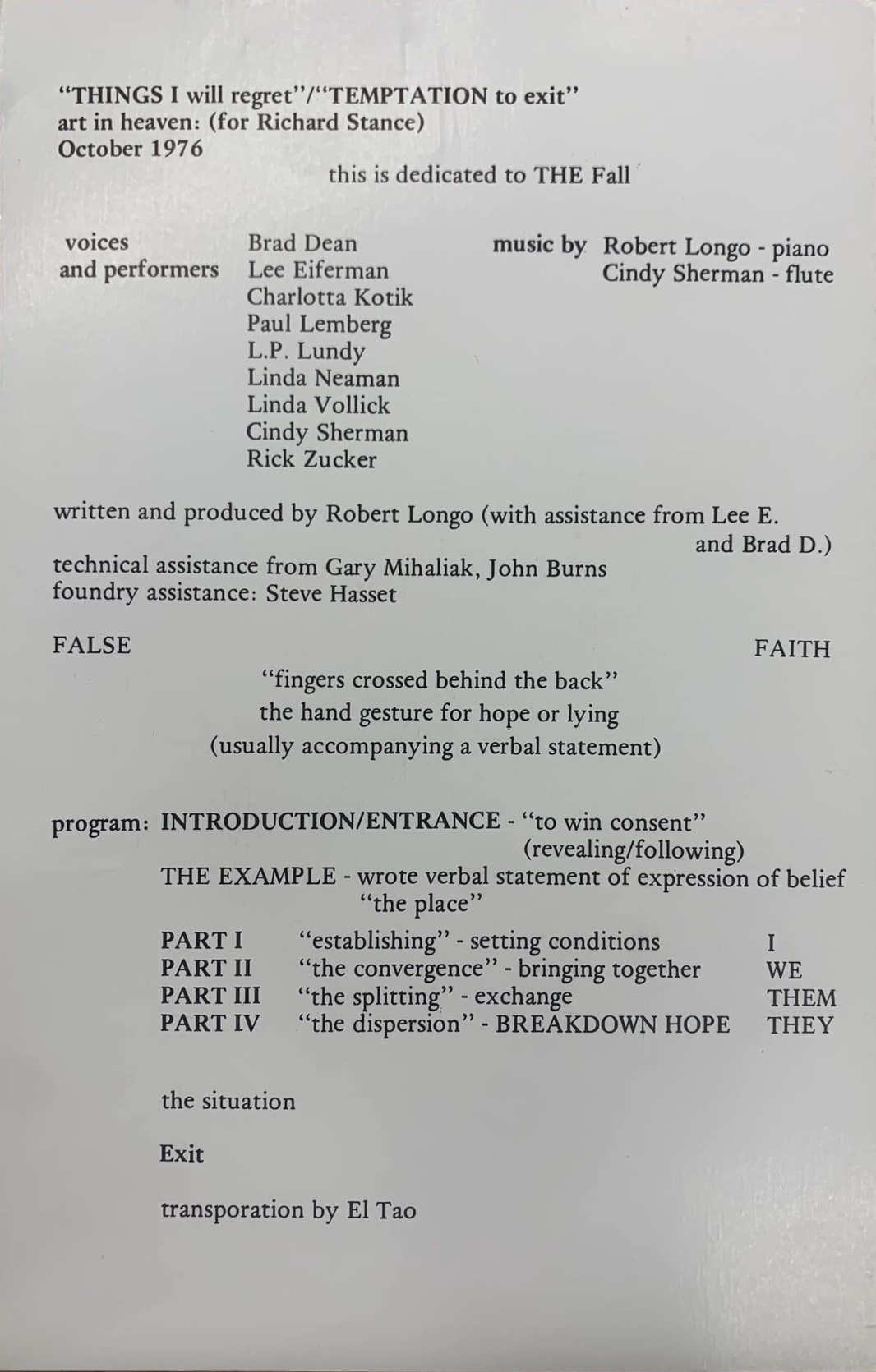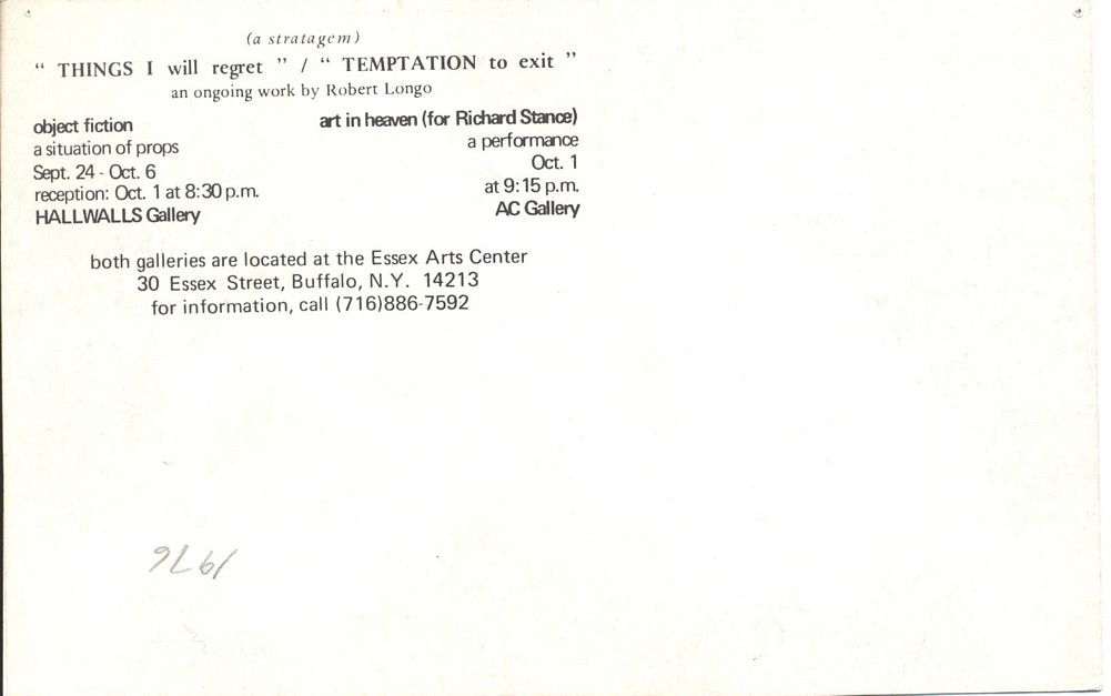 An exhibition of work by Robert Longo: OBJECT FICTION (a situation of props). Opening reception at Hallwalls on October 6, 1975, 8:30pm. Performance on October 1, 1975 ART IN HEAVEN (FOR RICHARD STANCE) at 9:15pm at AC Gallery [also located in the 30 Essex St., later Big Orbit, now BICA]. Postcard for events and exhibition says: (a stratagem) "THINGS I will regret" / "TEMPTATION to exit" an ongoing work by Robert Longo.