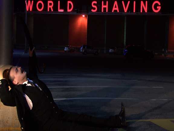 At the center of the exhibition is Worldshaving: Outro, a multichannel video installation collaboration with media and performance artist Chris Skinner featuring Skinner as the long-deceased industrialist and razor blade magnate and takes the form of a series of dramatic monologues cinematically fractured into discrete conversations with place and time. Melancholic musings, inauspicious thunderings, vexation, and disgust. Gillette appears as a figure in the waste landscape, a chimera of hopeful pontificate and snarling discontent—an Alceste, Don Quixote, Ghost of Christmas Present, none of the above. A discontented idealist who lays his admonitions upon the present.