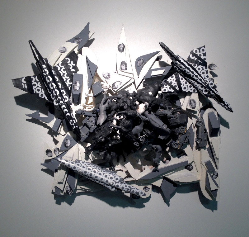 Artist Statement: George Afedzi Hughes' work uses the history of colonialism as a basis to highlight parallels between that violent history and contemporary global conflicts. ln today's informational age global occurrences of violence reach us through the media: transmitting fear that increasingly replaces sensations of calm. Hughes' work interprets in visual form the spectacle of information, knowledge and subjectivity. Furthermore, he investigates postcolonial reconciliation through competitive sports imagery, popular culture and narratives of multicultural societies.