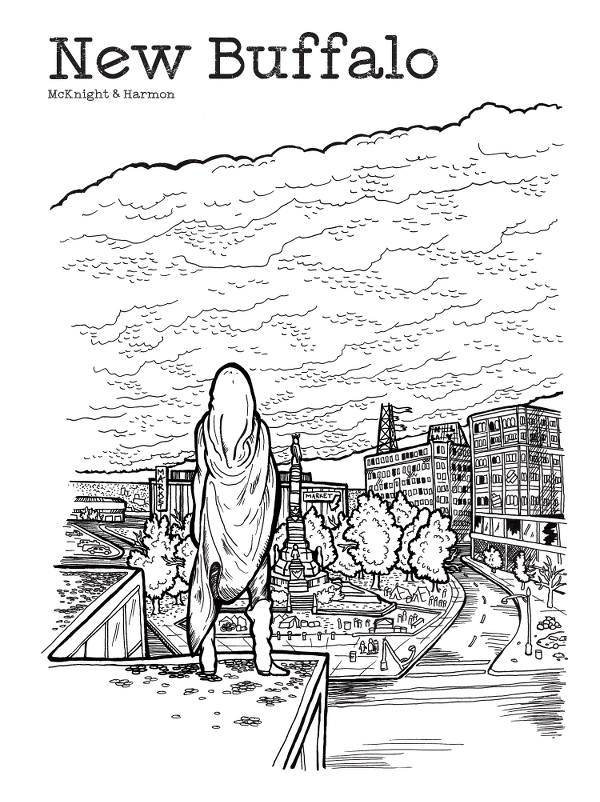 On his most recent work: "The New Buffalo is a graphic novel project from buffalo-based duo Dana Mcknight (curator and founder of Dreamland, Gos Gozah) and Mickey Harmon (The Life and Times of Grovey Cleves, A Pie-Eyed Night with Peggy O'Neil) satirizing the gentrification renaissance of their former zombie city.